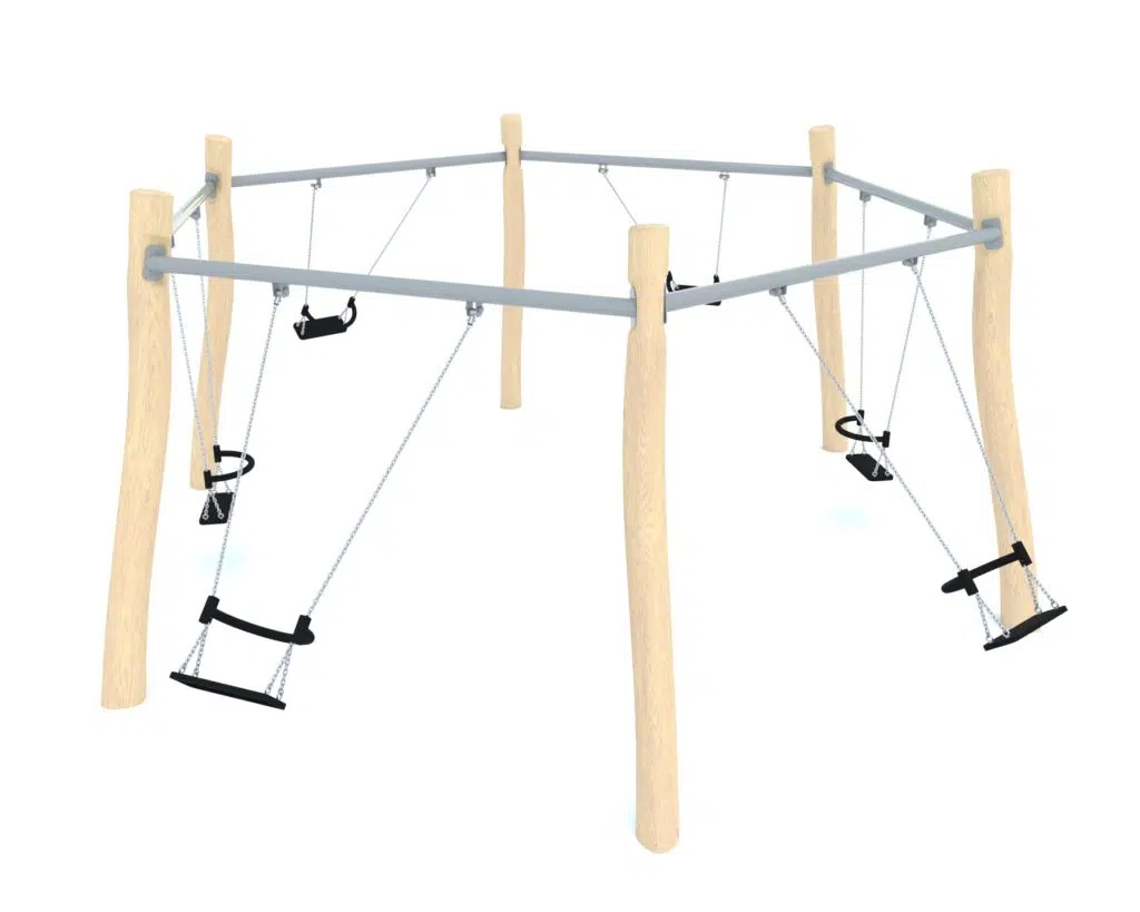La structure est équipée de six sièges simples suspendus par des cordages robustes, offrant un balancement stable et sécurisé. Les mouvements de balancier stimulent la motricité, l’équilibre et la coordination, tout en procurant un plaisir sensoriel unique. Les enfants peuvent ainsi jouer ensemble dans un environnement sûr et amusant, favorisant le développement moteur et la socialisation.