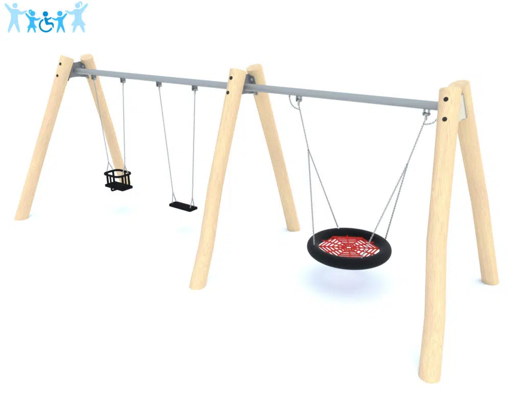 La balançoire offre une combinaison de deux sièges simples et un siège en nid d’oiseau, favorisant le jeu collectif, la socialisation et le partage. Les mouvements de balancement stimulent l’équilibre, la motricité et la coordination, tout en procurant un moment de plaisir sensoriel unique. Cette configuration permet également de créer un environnement inclusif, où les enfants de tous âges et de toutes capacités peuvent profiter ensemble du jeu en plein air.