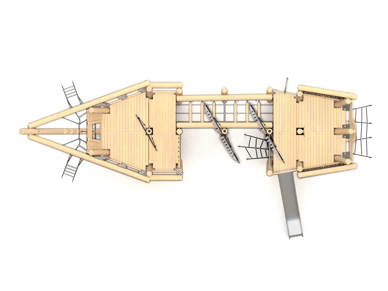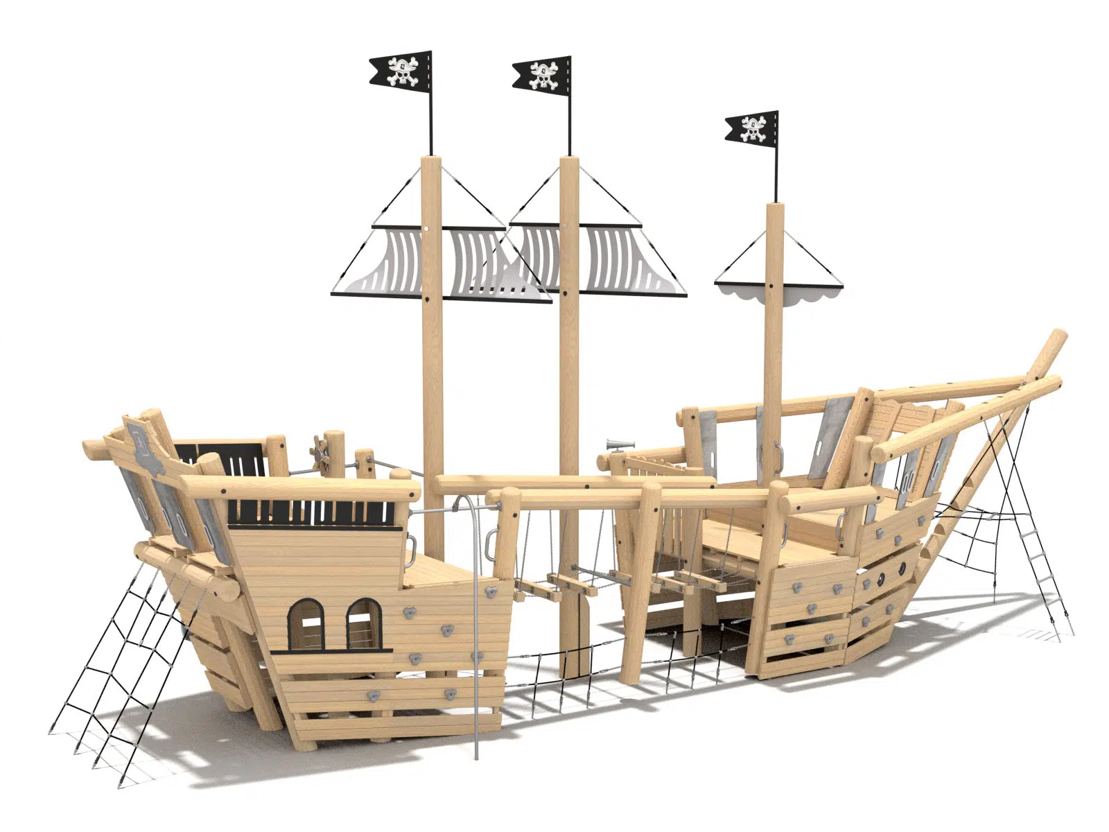 Cette grande structure est équipée de toboggans, cordages et passerelles, permettant aux enfants de grimper, se balancer et se déplacer à différents niveaux. Les modules sont conçus pour stimuler l’équilibre, la force physique et la coordination, tout en favorisant le jeu collectif et l’imagination. Les enfants peuvent s’inventer des aventures de pirates, de capitaines ou d’explorateurs, transformant chaque moment de jeu en une véritable expédition maritime.