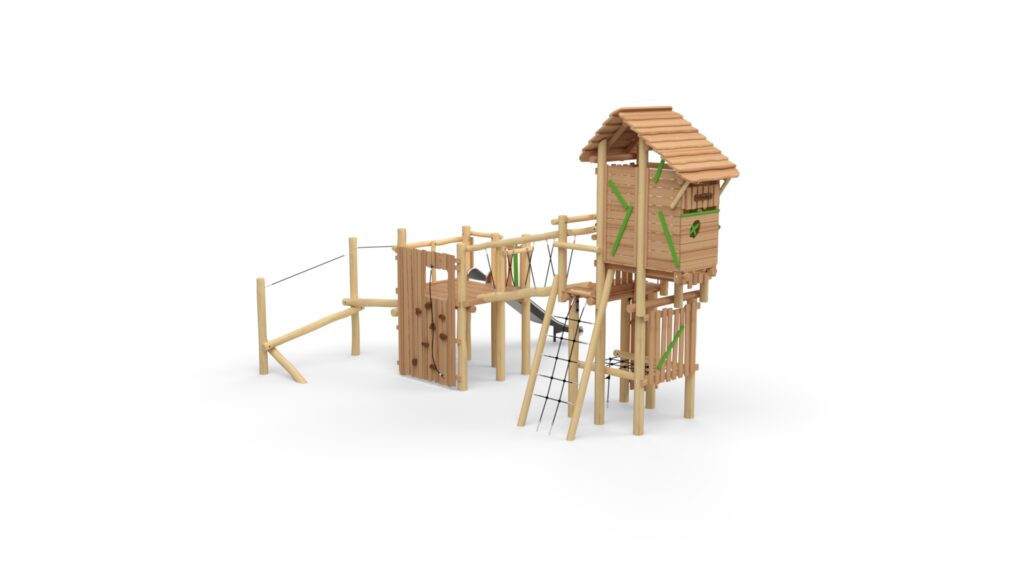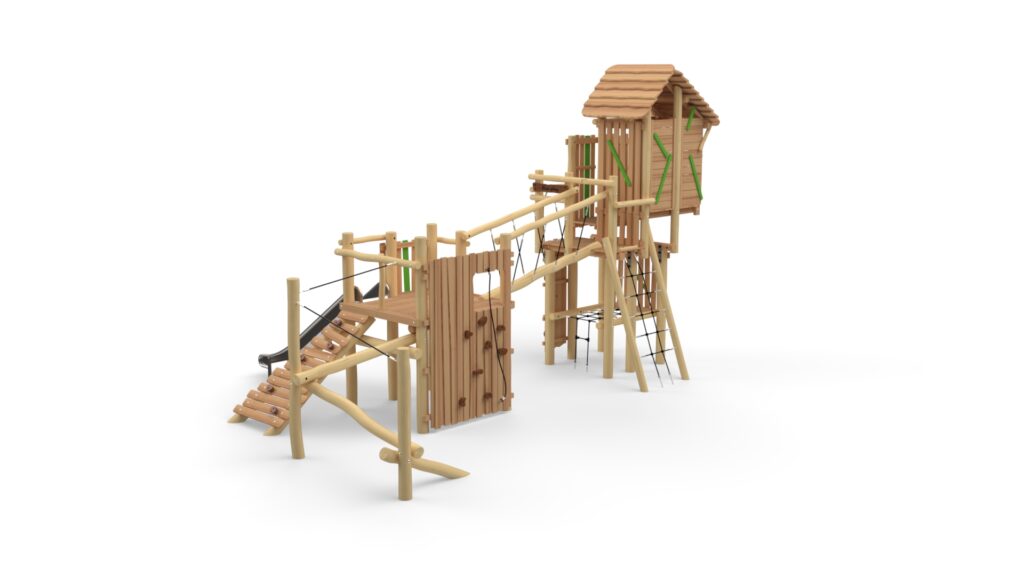La Combi-Forteresse s’articule autour d’une tour principale rappelant l’univers médiéval. Cette tour, accessible par plusieurs parcours de grimpe, stimule la motricité globale et encourage les enfants à développer équilibre, coordination et confiance en soi. Une cabane perchée intégrée à la structure offre un espace imaginaire propice aux jeux de rôle, aux moments de repos ou à la surveillance du royaume fictif qu’ils s’inventent. Le design naturel et irrégulier du robinier ajoute un caractère artisanal qui renforce l’immersion dans l’univers chevaleresque.
