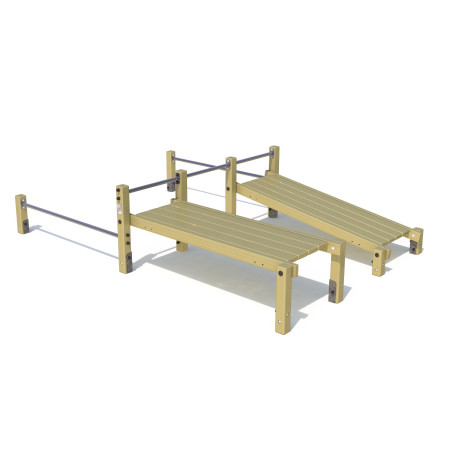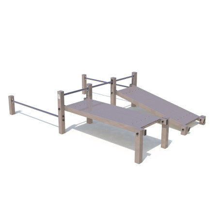 Le montage est simple et rapide, permettant une intégration aisée dans des aires de jeux, parcours santé ou parcours aventure. Son design modulable et sécurisé fait de ce combiné un équipement pratique, durable et attractif, idéal pour stimuler l’activité physique, la force et l’endurance des enfants tout en valorisant l’espace public.