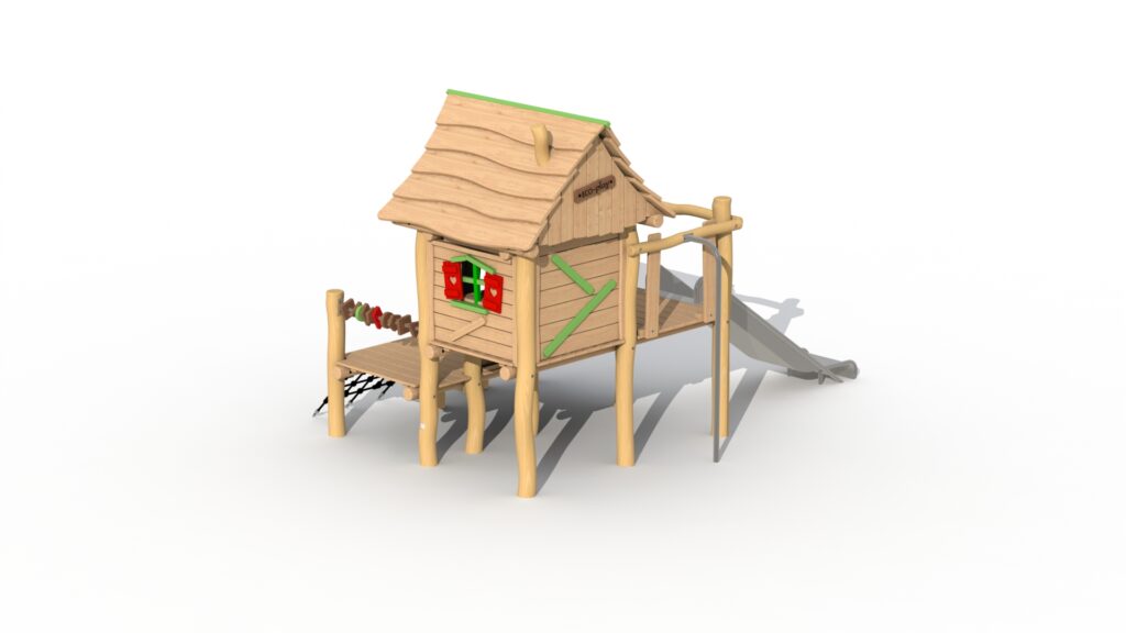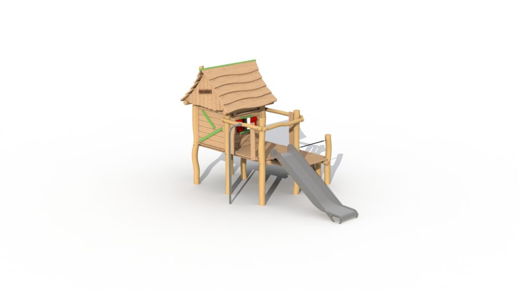 La structure de la Maison du Forestier Robinier est conçue pour garantir la sécurité des enfants. Les surfaces sont lisses, les bords arrondis et le toboggan intégré offre une descente sécurisée et amusante. Chaque élément est pensé pour minimiser les risques tout en permettant aux enfants de s’amuser librement et en toute confiance.