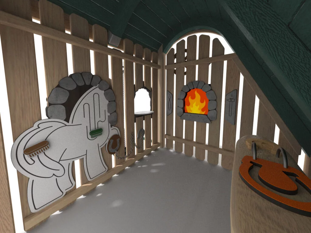 La particularité de ce modèle est sa section écurie intégrée, qui invite les enfants à explorer le monde équestre de manière ludique. Ils peuvent ainsi inventer des histoires, jouer à la ferme ou organiser des scénarios autour des animaux, stimulant leur imagination, leur motricité et leur capacité à collaborer avec les autres enfants. Cette fonctionnalité transforme la maisonnette en un équipement polyvalent et éducatif, adapté aux jeux collectifs et aux activités pédagogiques.