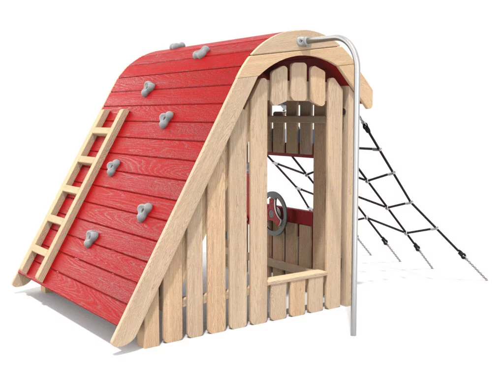 Fabriquée en bois de robinier, une essence naturellement durable et résistante aux intempéries et aux insectes, cette maisonnette ne nécessite aucun traitement chimique. Ses tons bois et rouges vifs attirent l’attention et s’intègrent harmonieusement dans les espaces verts, créant un point central ludique dans les parcs, jardins publics et aires de jeux. La structure fermée offre un espace sûr et intime, idéal pour les jeux de rôle et la socialisation.