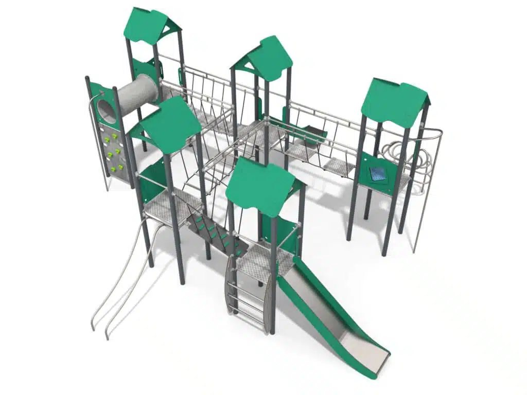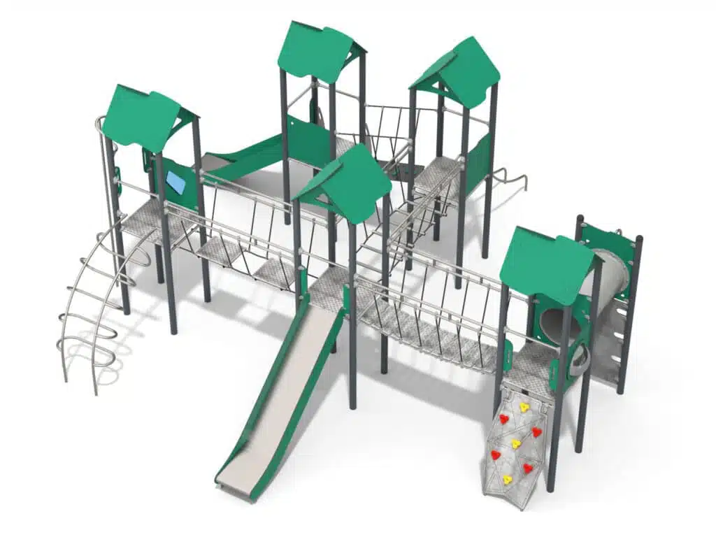 Avec des dimensions généreuses de 760 × 782 cm et une zone de sécurité de 1110 × 1132 cm (83 m²), le Recy’Haven offre un espace sécurisé et conforme à la norme EN 1176-1, garantissant aux collectivités et aux parents une tranquillité d’esprit totale. Sa hauteur totale de 357 cm et sa hauteur de chute libre de 163 cm permettent aux enfants de profiter d’une expérience de jeu verticale, favorisant le développement physique et la confiance en soi.
