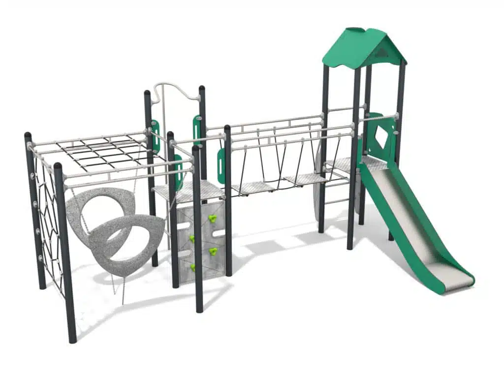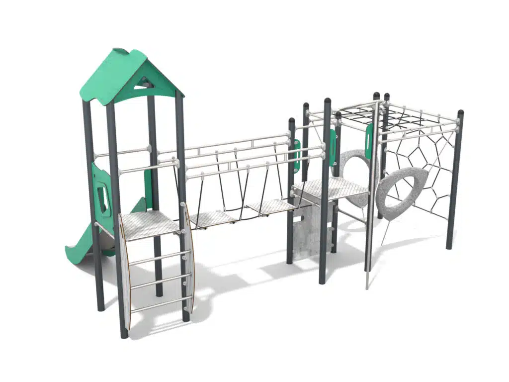 Pensé pour les enfants de 3 à 12 ans, le Recy’Rocket offre un parcours complet combinant grimpe, glisse et zones de socialisation. La structure encourage le développement de la motricité, de l’équilibre et de la coordination, grâce à ses différents modules de grimpe sécurisés et accessibles. Le toboggan intégré apporte une dimension ludique et dynamique, offrant aux enfants des descentes rapides et amusantes après leurs efforts d’escalade. Chaque élément du parcours est conçu pour stimuler l’imagination et favoriser le jeu collectif.