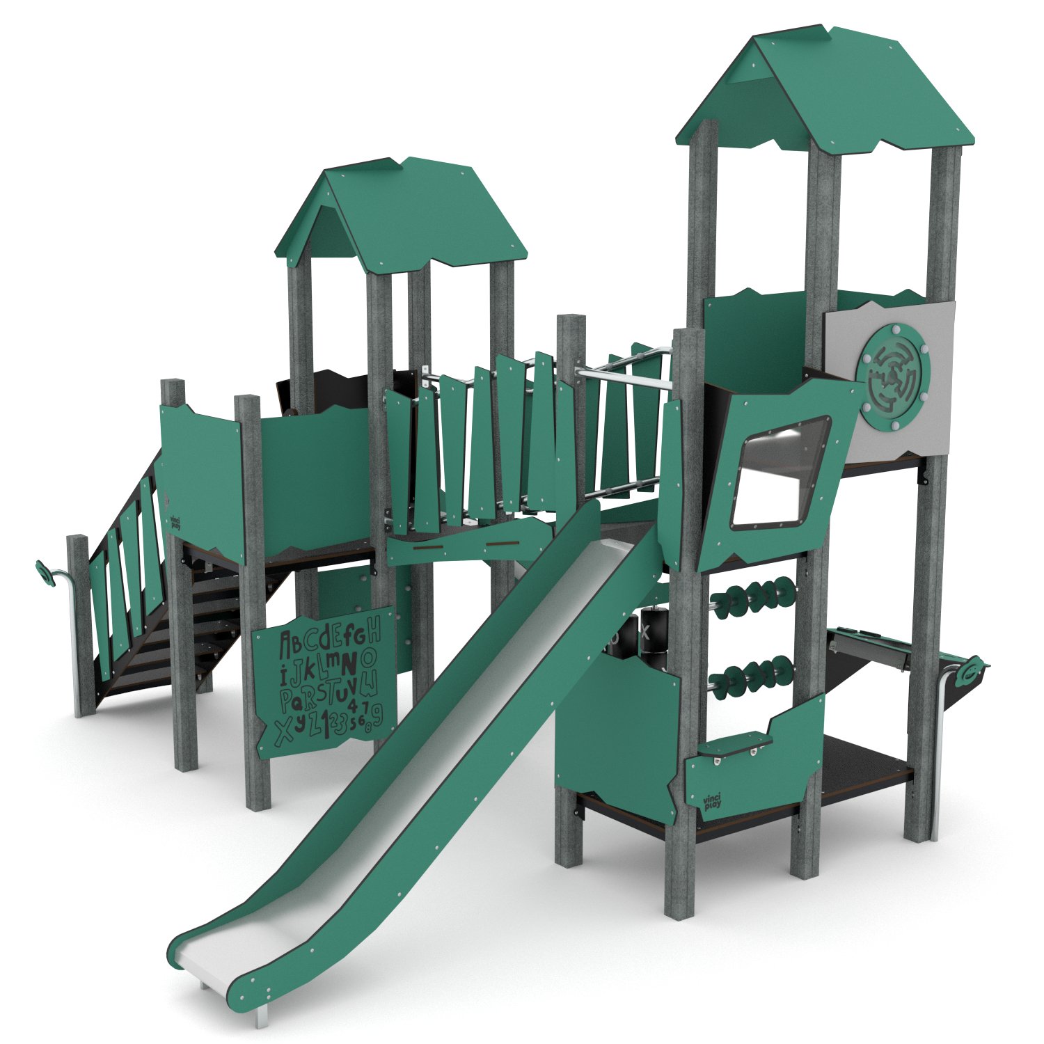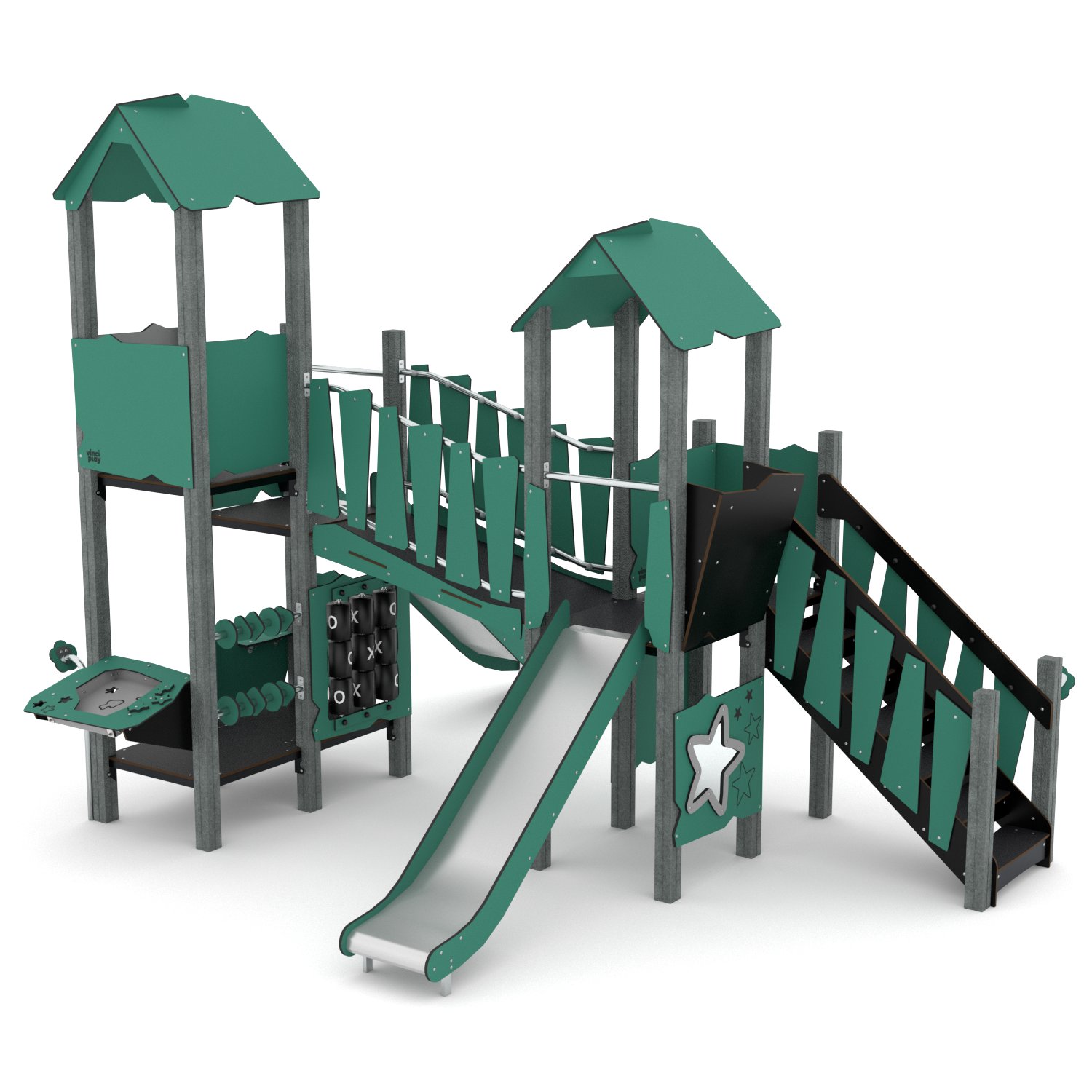 Avec son double toboggan intégré et ses zones de grimpe, le Recy’Zone transforme chaque aire de jeux en un véritable terrain d’aventure. Les enfants peuvent glisser simultanément sur le double toboggan, grimper sur les différentes structures et explorer les plateformes modulables. Ces activités stimulent leur motricité, leur équilibre et leur coordination, tout en encourageant la socialisation et le jeu collectif. Les multiples niveaux et accès de la structure offrent une expérience variée et interactive, captant l’attention des enfants et leur offrant un espace où ils peuvent s’amuser en toute liberté.