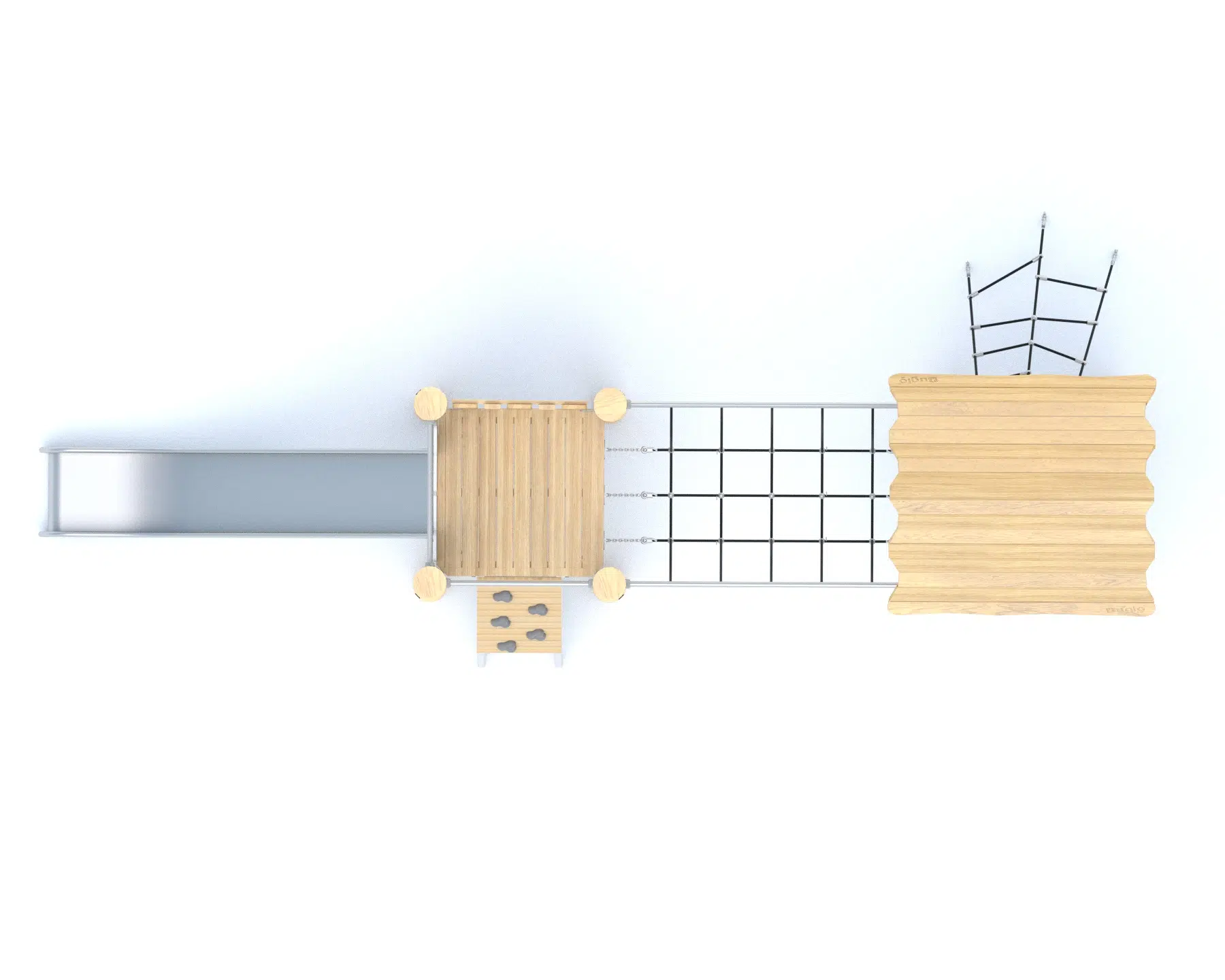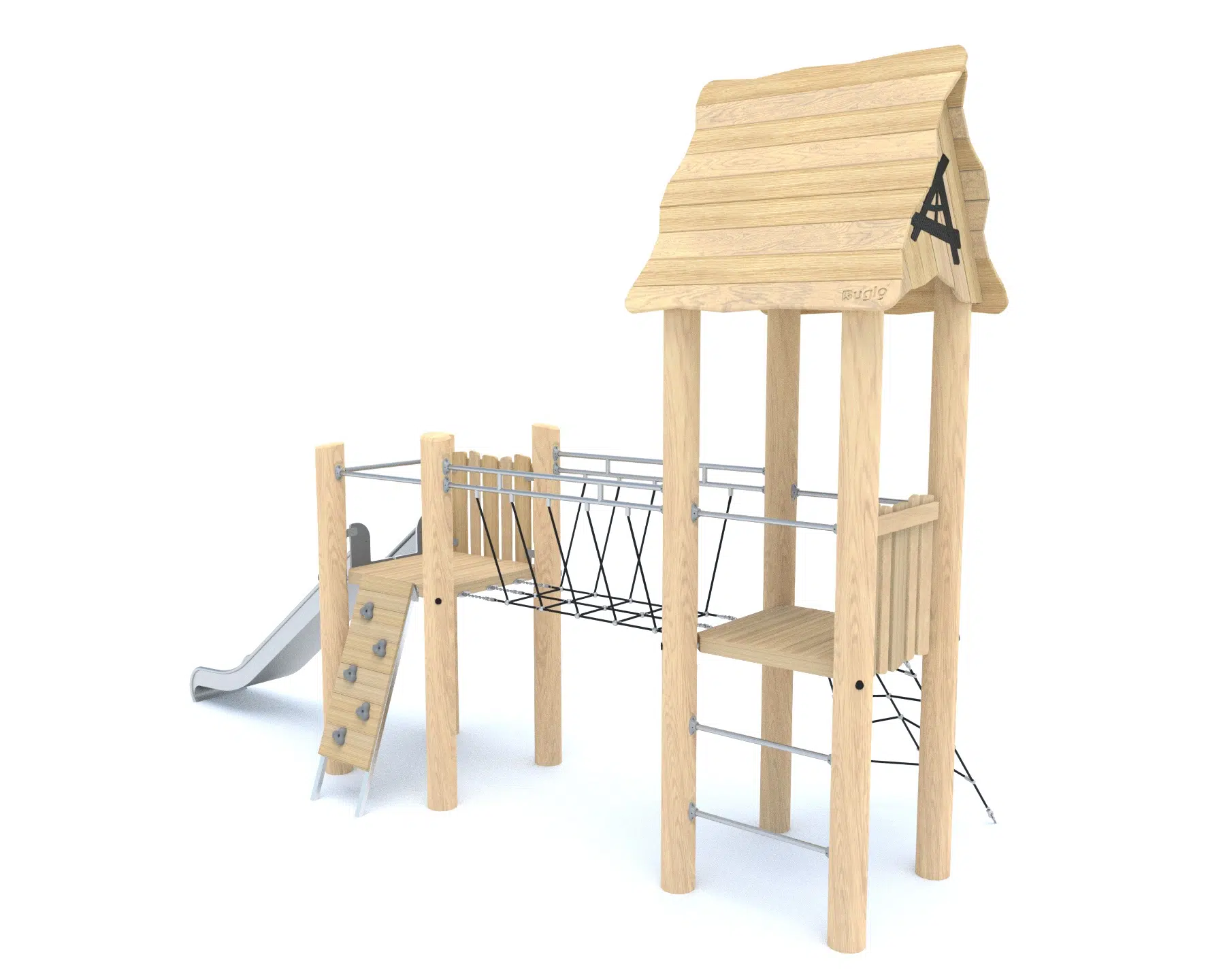 Cette aire de jeux comprend deux tours interconnectées, formant un parcours multi-activités varié et stimulant. Les enfants peuvent explorer différents modules tels que toboggans, passerelles, ponts suspendus, éléments d’escalade et cordages, favorisant le développement de l’équilibre, de la coordination et de la force physique. Chaque élément est conçu pour encourager le jeu collectif, la créativité et le jeu de rôle, transformant chaque session en véritable aventure.