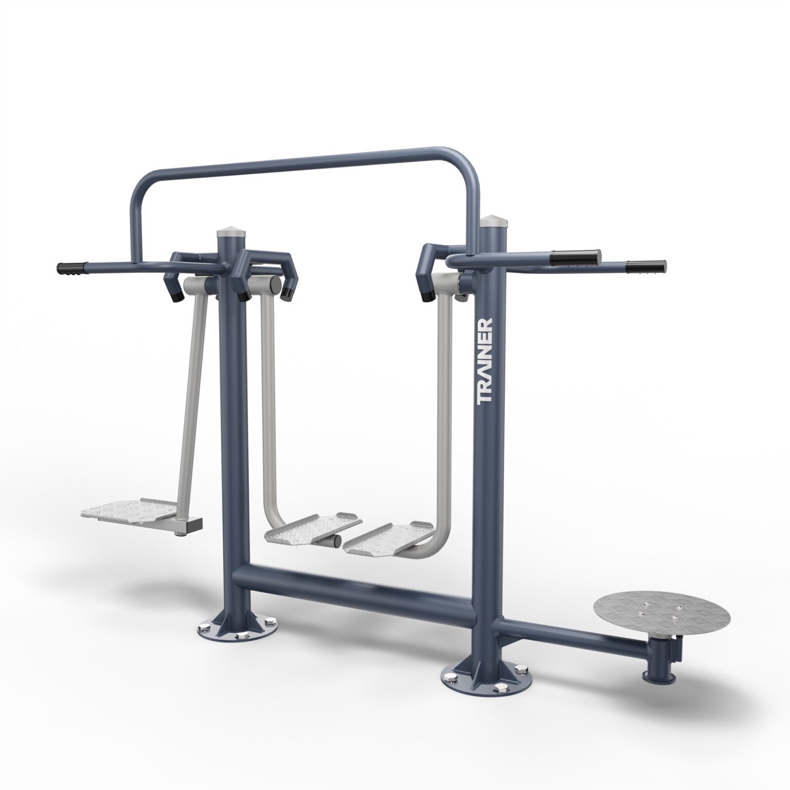 Les structures sont fabriquées en acier galvanisé et revêtues d’une double couche de peinture en poudre. Les sièges sont réalisés en panneaux de PEHD et les marches en aluminium.