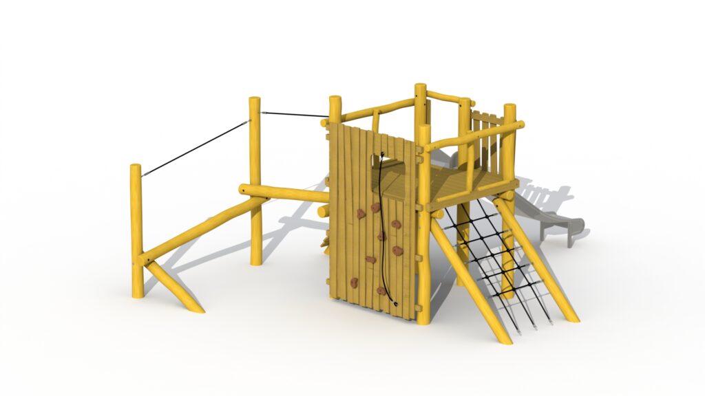 Au cœur de l’équipement, la tourelle en robinier sert de point de départ à une multitude d’activités ludiques. Les accès de grimpe offrent aux enfants une expérience sensorielle unique grâce aux formes organiques du bois, favorisant la coordination, la motricité et la confiance en soi. Le point culminant de la tour permet de profiter d’un espace d’observation avant de redescendre par le toboggan, élément incontournable qui apporte dynamisme et plaisir immédiat.